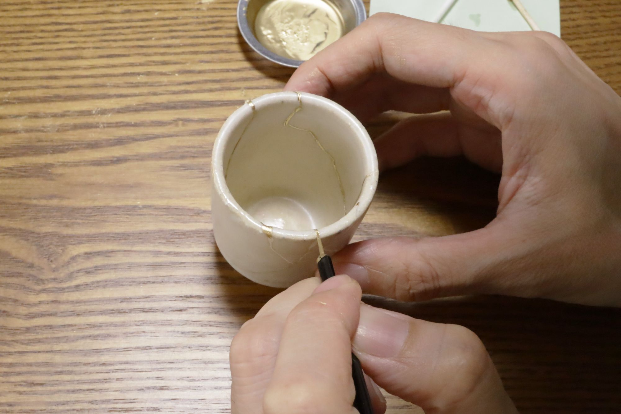 割れの線に沿って、器のカーブに合わせて細くキレイに線を描こうとしますが、